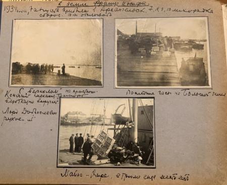 Texten högst upp: 1934, 7 augusti har anländit till Arhangelsk. 7,8,9,10 hektisk avlastning. 10-20 avländer.